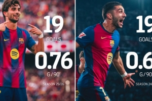 巴萨官方也晒出数据对比照,表示费兰本赛季已打进19球,追平他个人上赛季的总进球数。与此同时,费兰的每90分钟进球数也从上赛季的0.64球升至本赛季的0.76球。